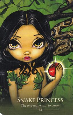 PRINȚESA ȘARPE VORBEȘTE: Nu sunt Eva. Eram aici înainte de a fi orice altceva. Din mine au venit toate lucrurile și în mine se vor întoarce. Sunt limba lumii și cea ai cărei ochi nu se închid niciodată asupra existenței tale. Eu dau naștere oului cosmic și din el curge creația. Mă mișc în copaci, …